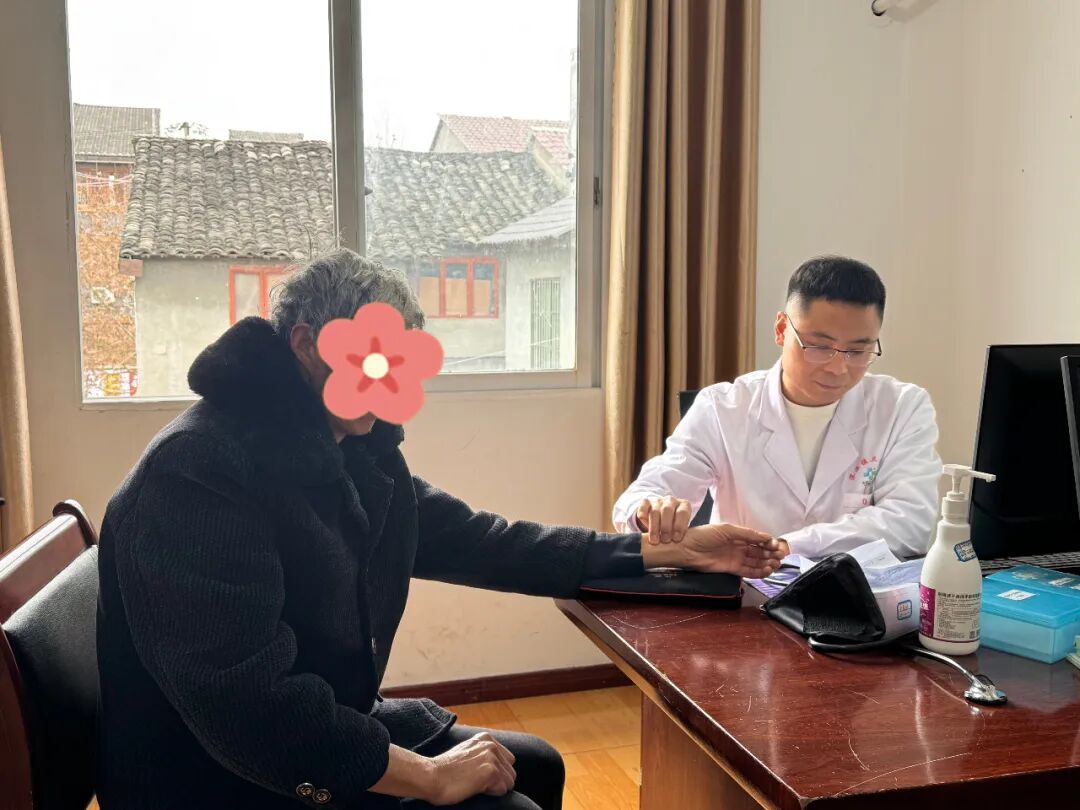 近日,在红花岗区深溪镇卫生院中医馆诊疗室内,患者王忠正在接受治疗,医生仔细检查了他的就医情况并详细叮嘱注意事项。